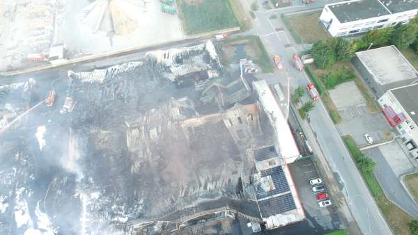 Die Feuerwehr ist aktuell mit Nachlöscharbeiten beschäftigt. Hierzu kommt auch ein Bagger zum Einsatz um die eingestürzten Gebäudeteile auseinander zu ziehen.
