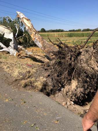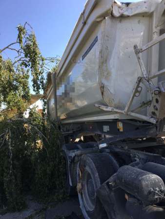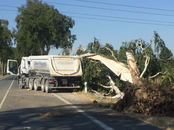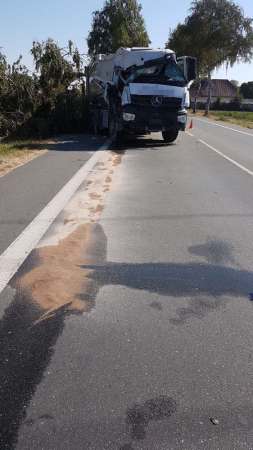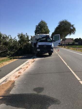 Der Fahrer eines Sattelzuges ist von der Fahrbahn abgekommen und gegen einen Straßenbaum geprallt. Der Baum wurde dadurch entwurzelt. Auf der Beifahrerseite wurde das Fahrerhaus massiv beschädigt. Der leichtverletzte Fahrer wurde vom Rettungsdienst versorgt und anschließend in ein Krankenhaus transportiert. Durch die Feuerwehr wurde das Fahrzeug gegen wegrollen gesichert, der Brandschutz wurde sichergestellt und ausgelaufene Betriebsstoffe wurden abgestreut.