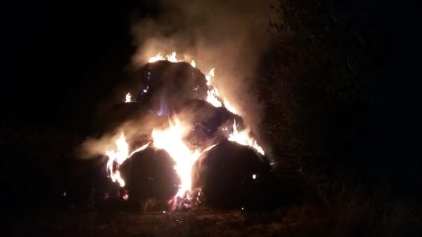 Der Brand von etwa 150 Strohballen beschäftigte am Freitagabend zahlreiche Einsatzkräfte der Feuerwehr und der Polizei in der Feldflur südlich von Dedinghausen. Nach derzeitigem Stand der Ermittlungen hatten unbekannte Täter neben der Straße "An der Bienenhütte" die auf einer Grundfläche von ca. 20m x 5m zu einer Pyramide aufgeschichteten Ballen in Brand gesetzt.