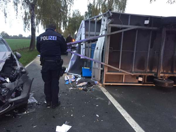 Heute Morgen befuhr ein 57-jähriger Lippstädter mit seinem Lastkraftwagen die Niederdedinghauser Straße in Richtung Mettinghausen. Als er mit seinem Zement beladenen Anhänger über eine Bodenwelle fuhr, löste sich der Anhänger und prallte gegen den Wagen einer 50-jährigen Autofahrerin aus Paderborn, die die Niederdedinghauser Straße in der Gegenrichtung befuhr. Zurzeit wird vermutet, dass der Anhänger bei der Inbetriebnahme nicht gänzlich in die Anhängerkupplung eingerastet war. Neben dem Fahrer des Lastkraftwagens und der Autofahrerin wurde auch die 21-jährige Beifahrerin des Lippstädters zur weiteren Untersuchung in ein Krankenhaus gebracht. Die Polizei schätzt den Sachschaden auf 8.000 Euro.
