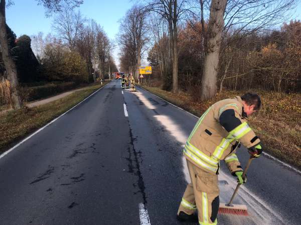 Eine ca. 300 m lange Ölspur, verursacht durch einen geplatzten Hydraulikschlauch an einem Trecker, wurde von der Feuerwehr abgestreut. Das verbrauchte Ölbindemittel wurde eingefegt und anschließend wieder aufgenommen.