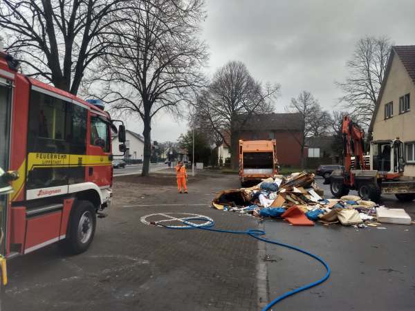 In einem Müllwagen ist es zu einem Brand gekommen, der vermutlich durch geplatzte Deo- und Haarsprayflaschen ausgelöst wurde. Die Ladung wurde direkt abgekippt und der brennende Müllhaufen wurde mit dem Schnellangriff abgelöscht.