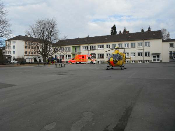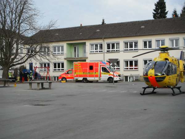 Ein Kind ist aus einer Schaukel gefallen. Der Rettungsdienst wurde unterstützt. Im weiteren Verlauf des Einsatzes wurde der Landeplatz für einen Rettungshubschrauber eingerichtet und der Brandschutz sichergestellt.