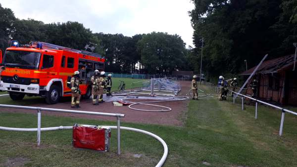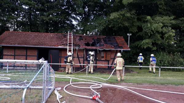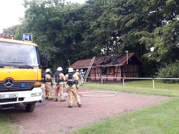 Am Samstag gegen 19.20 Uhr wurden die Feuerwehr und die Polizei zu einem Brand auf dem Gelände des Sportplatzes gerufen. Ein Materialhaus des Fußball-und Tennisvereins brannte. Die Feuerwehr Lippstadt führte die Brandbekämpfung durch. Während der Tatortaufnahme durch die Polizei machten Anwohner und Zeugen auf 3 Jugendliche aufmerksam, die wenige Minuten zuvor im Bereich der Eickelbornstraße eine Mülltonne in Brand setzten. Der Mülltonnenbrand konnte von den Anwohnern mit einem Eimer Wasser eigenständig gelöscht werden. Hierzu wird gesondert eine Strafanzeige gefertigt. Die sofort aufgenommenen Ermittlungen in diesem Fall führten zu zwei Tatverdächtigen. Einer der beiden Jugendlichen räumte auch die Beteiligung an der Brandstiftung des Materialhauses ein. An dem Materialhaus entstand erheblicher Sachschaden.