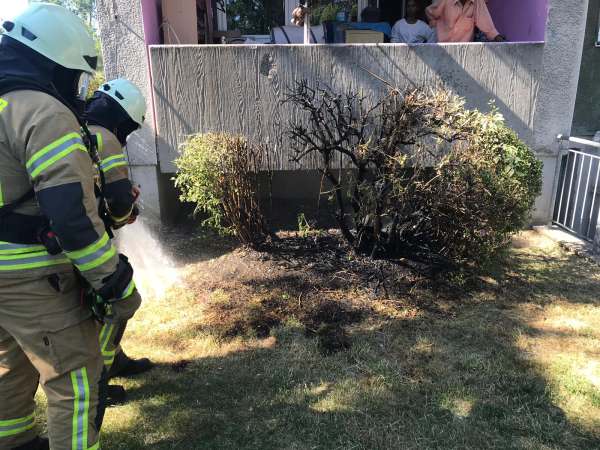 Bei Eintreffen der Feuerwehr brannte ein Busch vor einem Balkon. Zur Brandbekämpfung wurde ein Trupp unter Atemschutz mit einem C-Rohr eingesetzt.