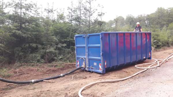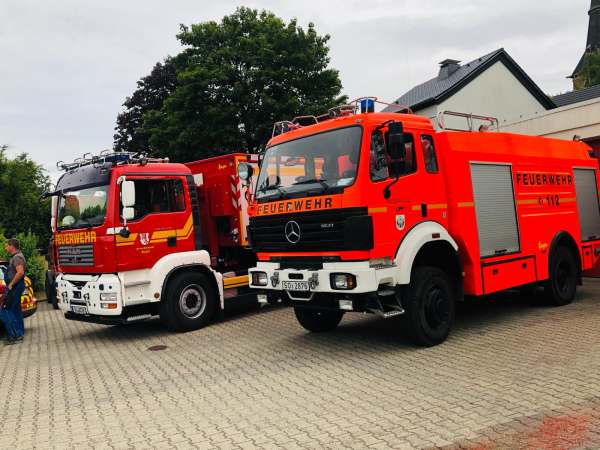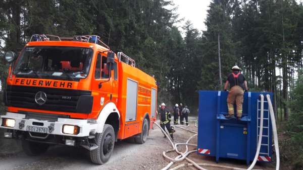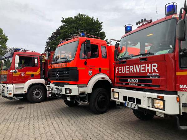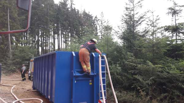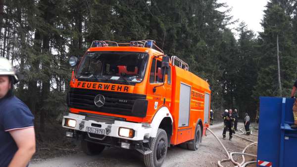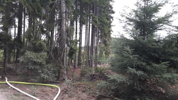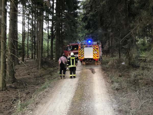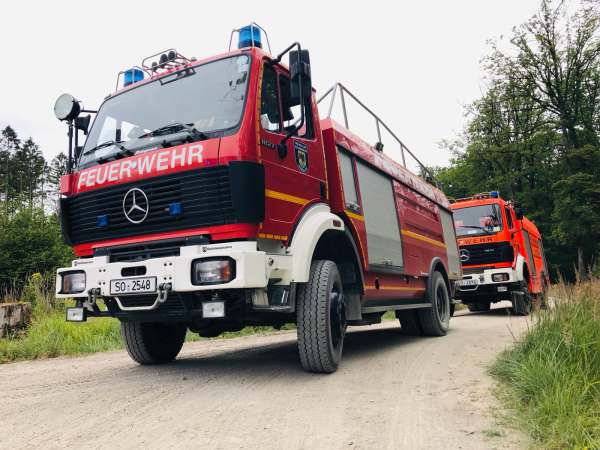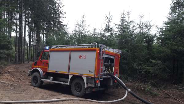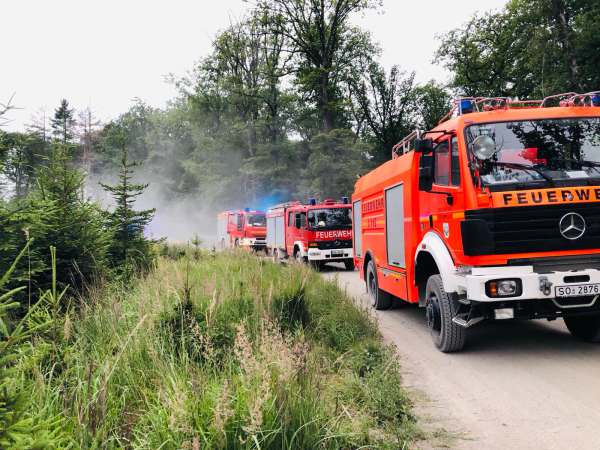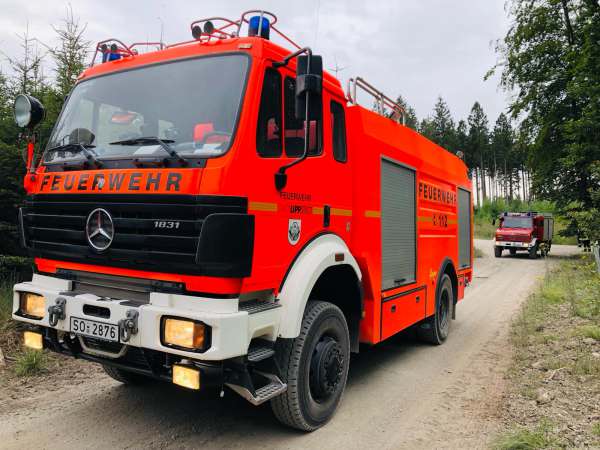 Pendelverkehr mit mehreren Tanklöschfahrzeugen aus Anröchte, Soest, Möhnesee und Warstein bei einem Waldbrand im Arnsberger Wald zwischen Warstein-Allagen und Warstein-Sichtigvor. Eine 3.500 Quadratmeter große Fichtenschonung steht in Flammen.