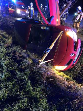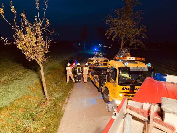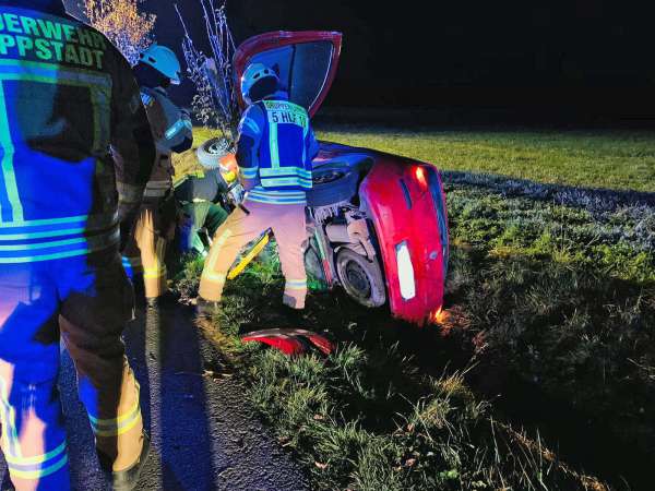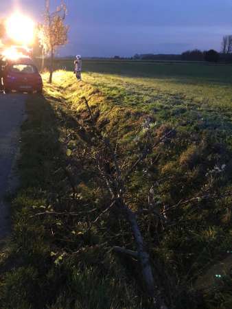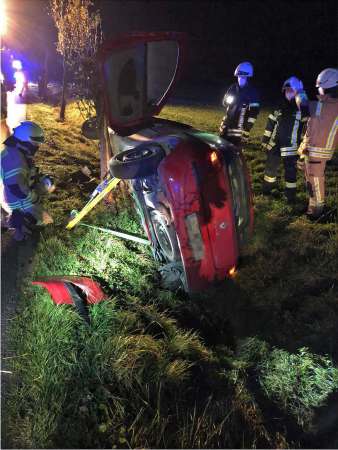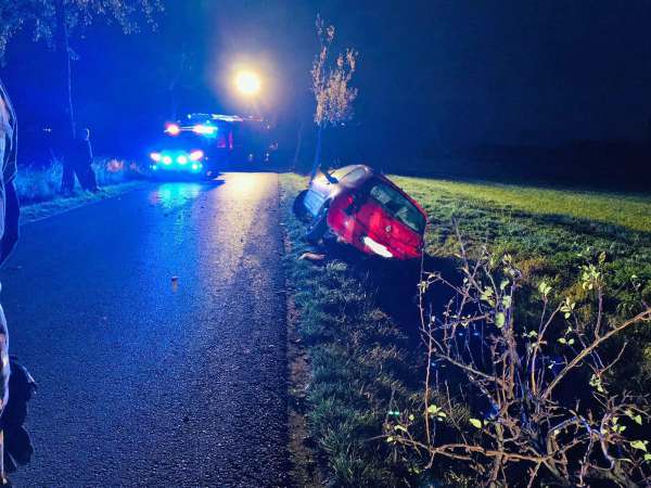 Gemeldet wurde ein Verkehrsunfall mit einer eingeklemmten Person. Bei Eintreffen der Feuerwehr lag ein Fahrzeug auf der Fahrzeugseite im Straßengraben. Das verunfallte Fahrzeug wurde gegen Umkippen und Wegrutschen gesichert. Die Person war nicht eingeklemmt. In Abstimmung mit dem Rettungsdienst konnte die Person eigenständig mit Unterstützung der Feuerwehr aus dem Fahrzeug klettern. Nach der Erstversorgung durch den Rettungsdienst folgte der Transport mit dem Rettungswagen in ein Krankenhaus. Der Brandschutz wurde sichergestellt. Ein beschädigter Baum wurde von der Feuerwehr gefällt. Die Fahrzeugbatterie wurde abgeklemmt und die Einsatzstelle wurde für die Polizei und das Abschleppunternehmen ausgeleuchtet.