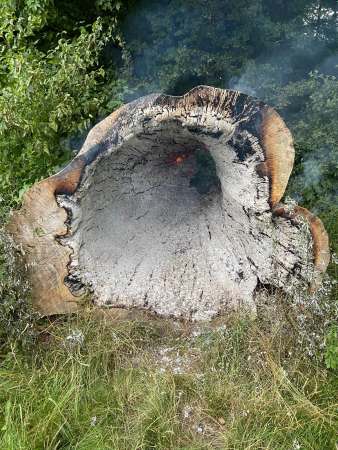 Ein brennender hohler Baumstumpf wurde von einem Trupp unter Atemschutz mit dem Schnellangriff abgelöscht.