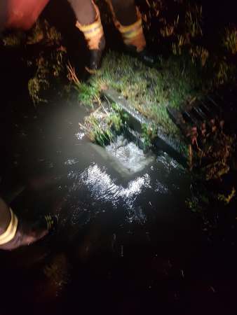 Auf einer Länge von ca. 20 m war die Fahrbahn ca. 10 cm hoch überflutet. Der Bereich wurde von der Feuerwehr gegen den fließenden Verkehr abgesichert Ursache für die Überflutung war ein verstopfter Gulli. Diese wurde von Unrat befreit. So konnte das angestaute Wasser innerhalb von Minuten abfließen.