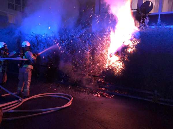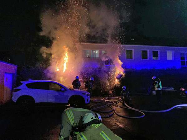 Eine brennende Hecke wurde von der Feuerwehr von zwei Trupps unter Atemschutz abgelöscht. Ein Übergreifen auf ein Wohnhaus konnte verhindert werden.