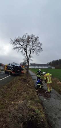 Aus ungeklärter Ursache ist ein Pkw von der Fahrbahn abgekommen und gegen zwei Straßenbäume geprallt. Die Einsatzstelle wurde gegen den fließenden Verkehr gesichert. Der Brandschutz wurde sichergestellt. Das verunfallte Fahrzeug wurde gegen Wegrollen oder Wegrutschen gesichert. Der Fahrer wurde mit Unterstützung der Feuerwehr aus dem Fahrzeug geholt und anschießend an den Rettungsdienst übergeben. Die beschädigten Straßenbäume wurden von der Feuerwehr beseitigt.