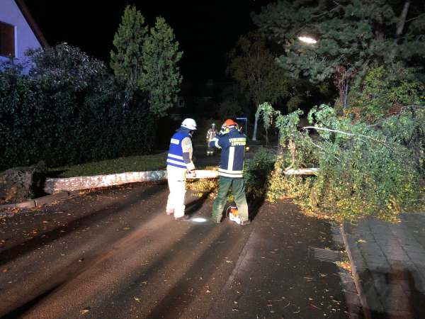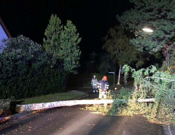 Eine ca. 8 m hohe Birke ist auf die Fahrbahn gestürzt. Der Baum wurde von der Feuerwehr mittels Kettensäge beseitigt.