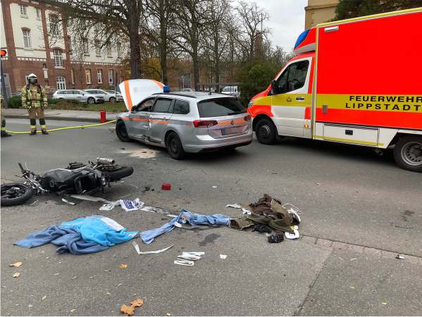 Verkehrsunfall Pkw gegen Motorrad. Ein Entstehungsbrand an dem Motorrad wurde von Passanten mittels Pulverlöscher abgelöscht. Beide Fahrer wurden durch Einsatzkräfte der Feuerwehr erstversorgt und anschließend zur weiteren Behandlung an den Rettungsdienst übergeben. Der Brandschutz wurde sichergestellt und Batteriemanagement wurde durchgeführt.
