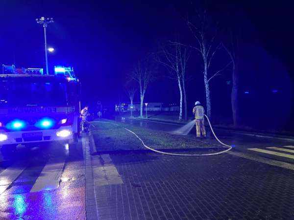 Im Kreisverkehr Holzstraße / Ostlandstraße / Quellenstraße / Wiedenbrücker Straße kam es durch einen Schwertransport zu Beschädigungen der Straßenbankette. Bedingt dadurch gelangten größere Mengen Erdreich auf die Fahrbahn. Die Fahrbahn wurde von der Feuerwehr mittels Schaufeln und zwei C-Rohren, auf Anforderung der Polizei, gesäubert.