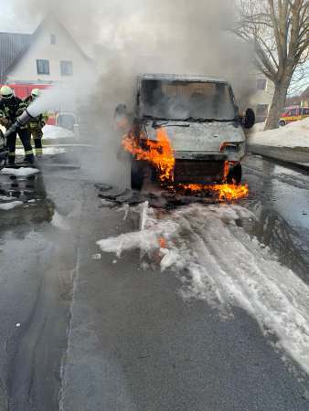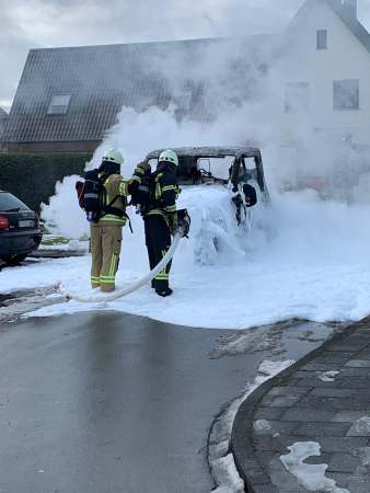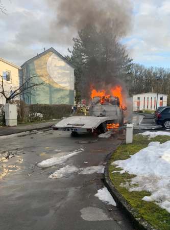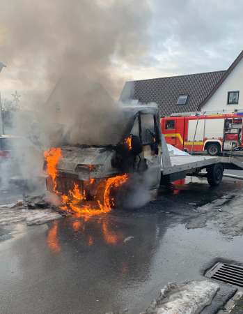 Ein brennendes Abschleppfahrzeug wurde von einem Trupp unter Atemschutz mit einem Schaumrohr abgelöscht.