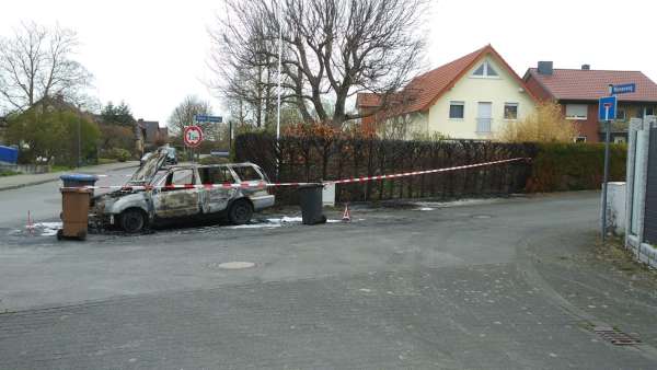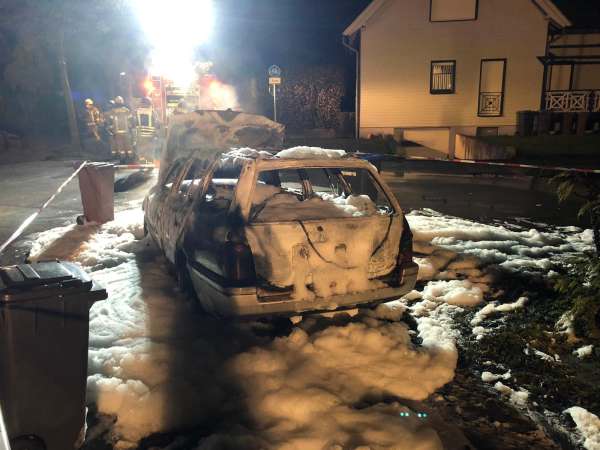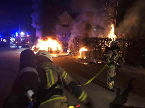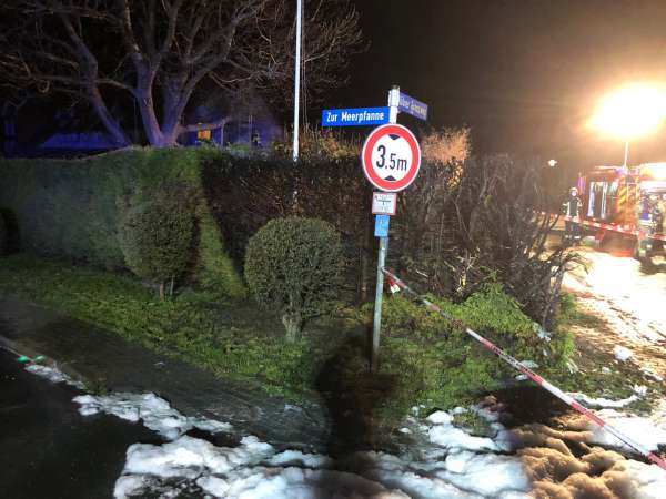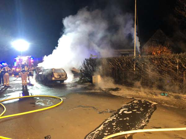 Die Feuerwehr wurde zu einem Pkw- und Heckenbrand in den Kreuzungsbereich Zur Meerpfanne / Kölner Grenzweg alarmiert. Bei Eintreffen der Feuerwehr brannte ein Pkw in voller Ausdehnung. Das Feuer war von dem Pkw auf eine Lebensbaumhecke und einen Stromverteilerkasten übergegriffen. Die Hecke brannte auf einer Länge von ca. 20 m.