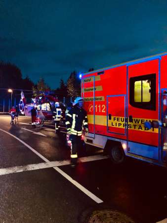 Eine Person ist von einem Baugerüst, aus einer Höhe von ca. 4-5 m, gestürzt und zwischen Paletten mit eingeschweißten Dachpfannen eingeklemmt worden. Die verunfallte Person wurde von der Feuerwehr befreit und an den Rettungsdienst übergeben.