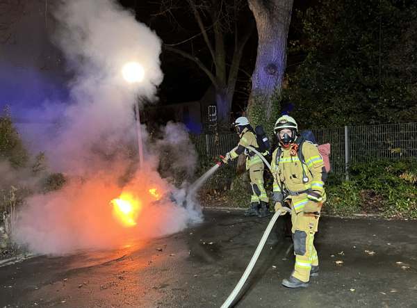 Auf dem Schulhof einer Grundschule brannte eine 1.000l Mülltonne. Diese wurde mit einem C-Rohr abgelöscht. Anschließend wurde der Inhalt ausgeräumt und auf Glutnester mit der Wärmebildkamera kontrolliert.