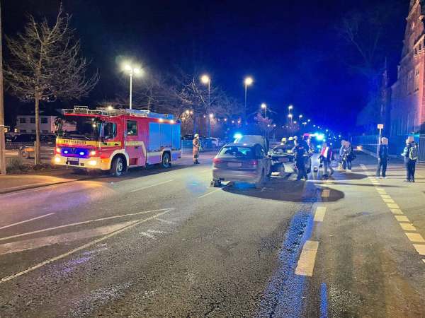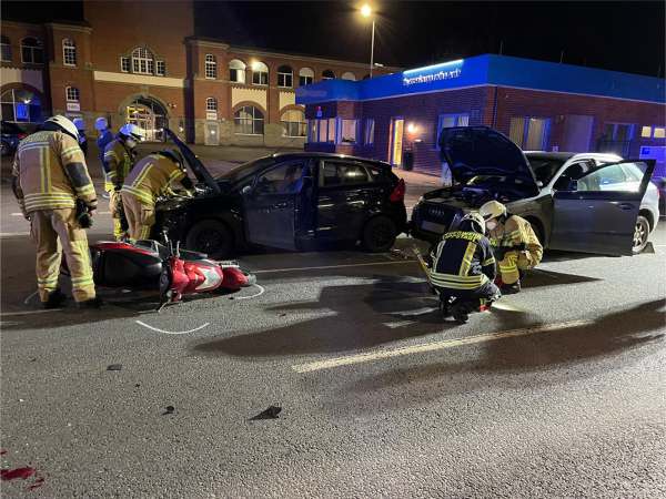 Auffahrunfall mit mehreren Fahrzeugen und einem Motorroller. Die Einsatzstelle wurde ausgeleuchtet, der Brandschutz wurde sichergestellt und die Fahrzeugbatterien wurden abgeklemmt. Betriebsstoffe waren nicht ausgelaufen.