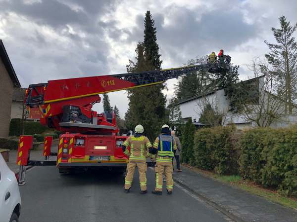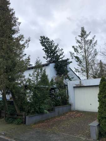 Baum gegen Hauswand gestürzt, droht auf die Straße zu stürzen.