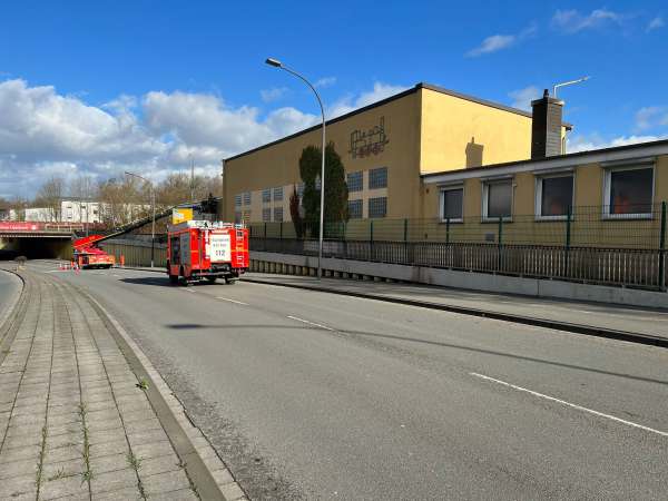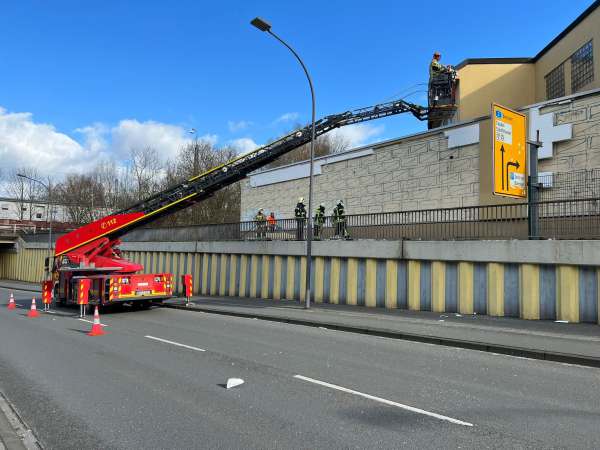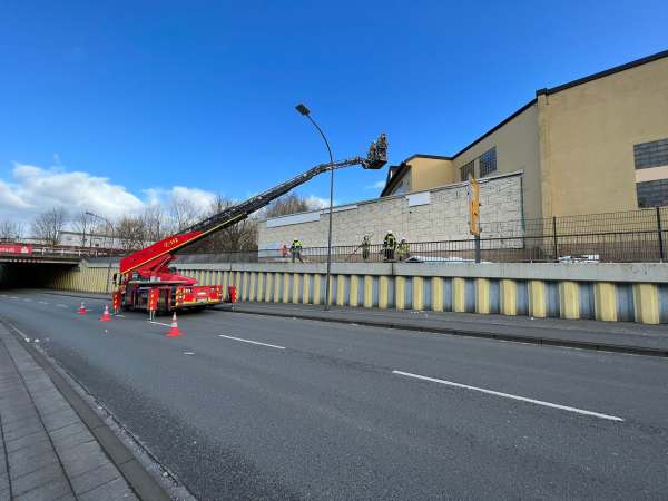 Fassadenteile von einem Bahngebäude stürzen herab und verteilen sich auf der Stirper Straße, in Fahrtrichtung Norden. Die Stirper Straße ist im Moment in Fahrtrichtung zur Udener Straße gesperrt.