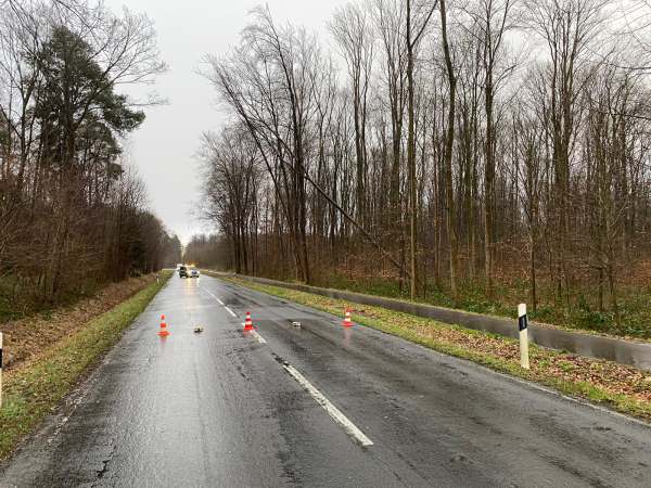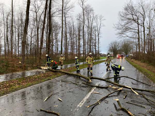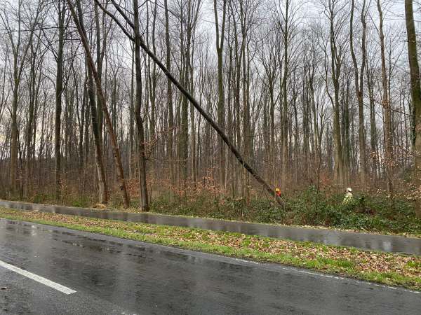 Baum in Schieflage, drohte auf die Fahrbahn und Radweg zu stürzen. Der Baum wurde von der Löschgruppe Dedinghausen beseitigt. Die Ehringhauser Straße wurde während der Arbeiten in Abstimmung mit der Polizei für den Verkehr gesperrt.