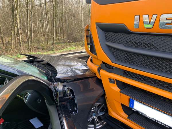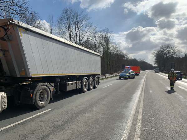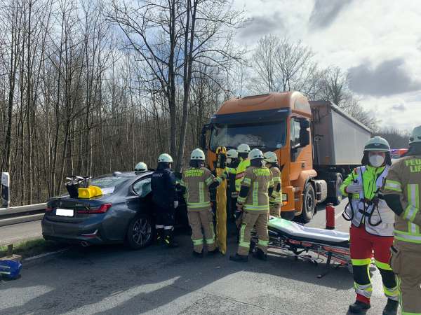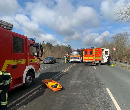 Gemeldet wurde ein Verkehrsunfall mit einer eingeklemmten Person. Bei Eintreffen der Feuerwehr befand sich der Pkw vor einem Lkw auf der rechten Fahrspur Fahrtrichtung Lipperbruch. Im vorderen linken Bereich war der Pkw stark deformiert, sowie die rechte Stoßstange und Radkasten vom LKW. Die Einsatzstelle wurde gegen den fließenden Verkehr abgesichert und der Brandschutz wurde sichergestellt. Der Fahrer vom Pkw war im Fahrzeug eingeschlossen und wurde umgehend vom Rettungsdienst betreut und versorgt. Der Lkw-Fahrer und der Beifahrer befanden sich außerhalb vom Fahrzeug an der Leitplanke und wurden ebenfalls vom Rettungsdienst betreut. Auslaufende Betriebsstoffe wurden nicht festgestellt.