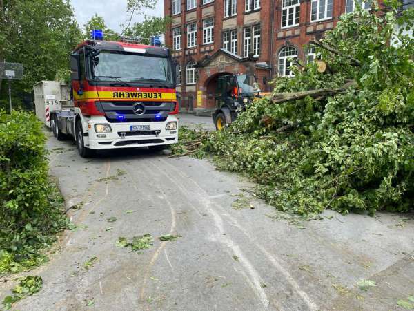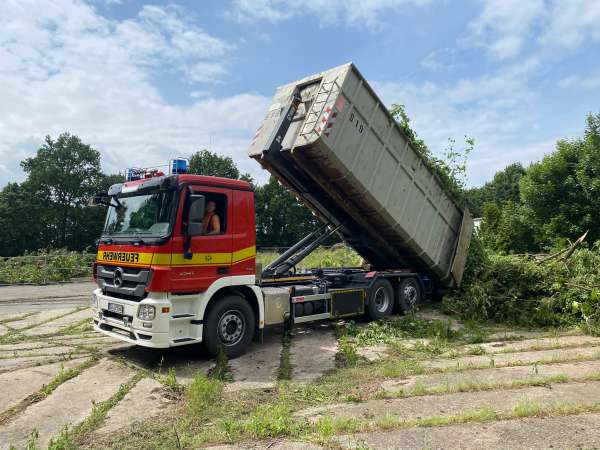Seid dem Morgen sind Einsatzkräfte aus dem LZ1, LG Benninghausen, LG Lipperode und LG Hörste im Stadtgebiet im Einsatz, um immer noch vorhandene Gefahrenstellen zu beseitigen. Am Mittag wurden diese Kräfte durch die Löschgruppen Dedinghausen, Esbeck und Rixbeck abgelöst. Das WLF der Feuerwehr Lippstadt hat mit einer Mulde beim Abtransport von Bauschutt und Holzschnitt unterstützt.