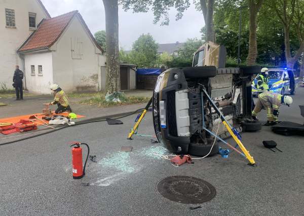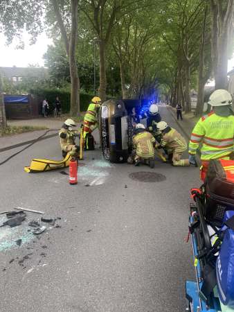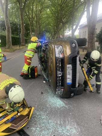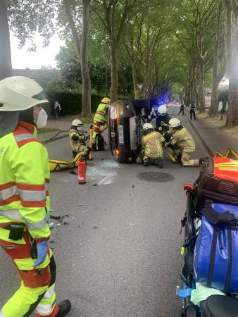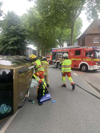 Verkehrsunfall mit zwei beteiligten Fahrzeugen im Kreuzungsbereich Südstraße / Elserstraße. Durch den Zusammenstoß der Fahrzeuge im Kreuzungsbereich ist ein Fahrzeug auf die Seite gekippt. Das Fahrzeug wurde von der Feuerwehr gegen umkippen gesichert. Die Fahrerin war im Fahrzeug eingeklemmt und wurde von der Feuerwehr aus dem Fahrzeug befreit.