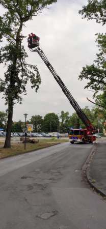 Ein großer Ast drohte aus der Baumkrone zu fallen, dieser wurde über die Drehleiter mittels Kettensäge entfernt.