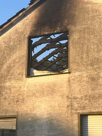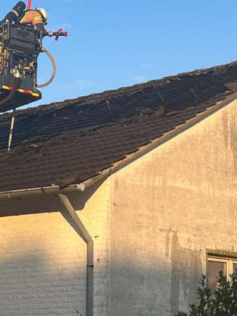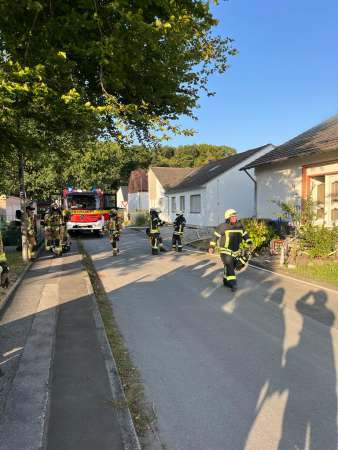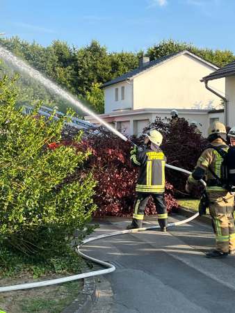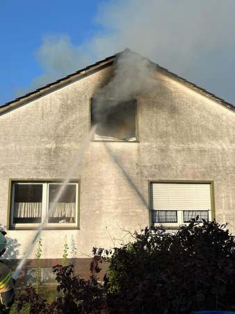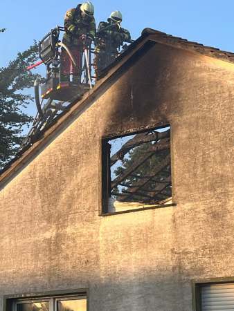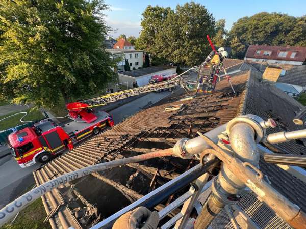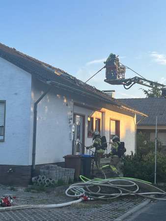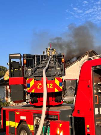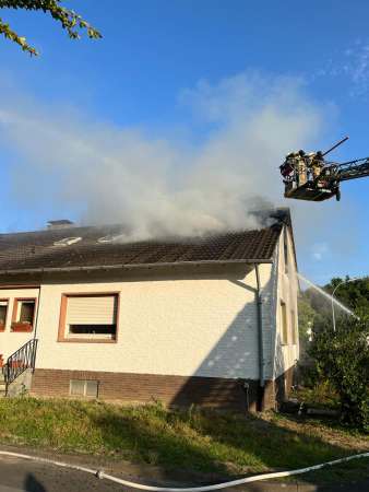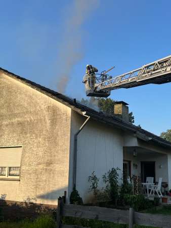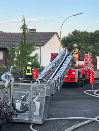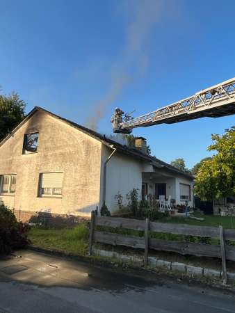 Aus bislang ungeklärter Ursache stand ein Zimmer im Dachgeschoss im Vollbrand. Ein sogenannter Innenangriff war nicht möglich. Zur Brandbekämpfung wurden von außen zwei C-Rohre eingesetzt. Dabei erfolgten Löschmaßnahmen auch über den Korb der Drehleiter, eine kurze Zeit waren beide Drehleitern gleichzeitig im Einsatz. Um den Zimmerbrand besser löschen zu können, wurde von außen über den Korb der Drehleiter die Dachhaut geöffnet. Es wurden keine Personen verletzt. Die Bewohner konnten vor Eintreffen der Feuerwehr das Einfamilienhaus eigenständig verlassen.