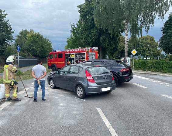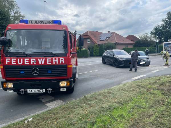 Verkehrsunfall mit zwei beteiligten Fahrzeugen im Kreuzungsbereich Puisterweg / Friedhofstraße / Vorderheide. Zwei verletzte Personen wurden vom Rettungsdienst untersucht und anschließend in ein Krankenhaus transportiert. Der Leitende Notarzt (LNA) und der Organisatorische Leiter Rettungsdienst (OrgL) konnten die Einsatzfahrt abbrechen. Ausgelaufene Betriebsstoffe wurden von der Feuerwehr mit Bindemittel abgestreut. Fahrzeugbatterie wurde abgeklemmt.