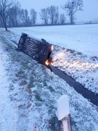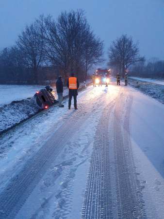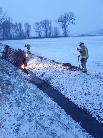 Aus ungeklärter Ursache ist ein Fahrzeug zwischen Mönninghausen und Hörste von der Fahrbahn abgekommen und auf dem Dach liegend im Graben vorgefunden worden. Zwei Fahrzeuginsassen wurden vom Rettungsdienst untersucht und anschließend in ein Krankenhaus transportiert.