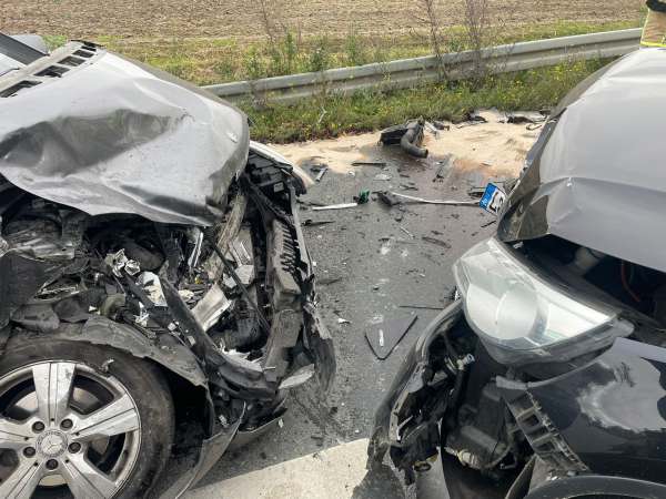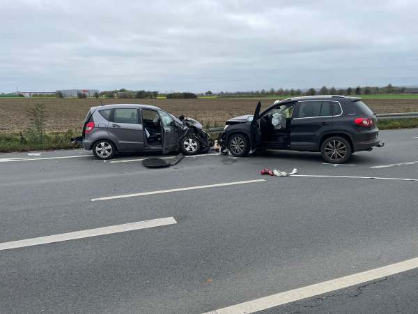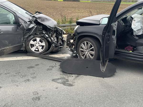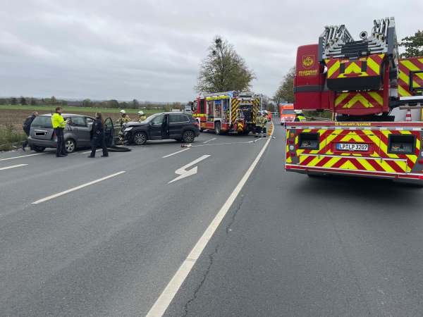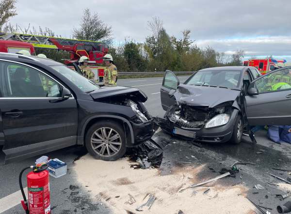 Verkehrsunfall mit zwei beteiligten Fahrzeugen und drei verletzten Personen. Alle verletzten Fahrzeuginsassen wurden vom Rettungsdienst behandelt und anschließend in umliegende Krankenhäuser transportiert. Ausgelaufene Betriebsstoffe wurden von der Feuerwehr mit Ölbindemittel abgestreut und anschließend wurde das verbrauchte Ölbindemittel wieder aufgenommen.