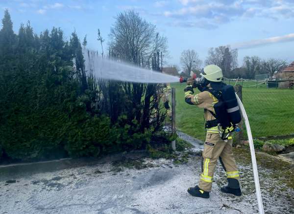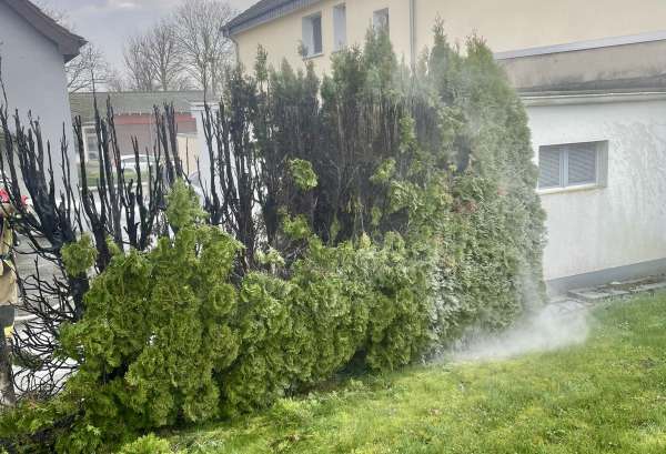 Heckenbrand auf einer Länge von 4 m. Löschmaßnahmen durch Anwohner vorgenommen, weitere Löschmaßnahmen mit einem C-Rohr von einem Trupp unter Atemschutz von der Feuerwehr.