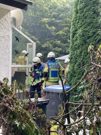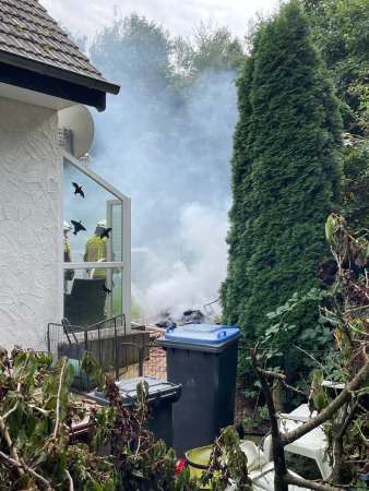 Rauchentwicklung im Garten. Ein Kleinbrand wurde mit einem C-Rohr abgelöscht. Das Haus wurde von einem Trupp unter Atemschutz kontrolliert.