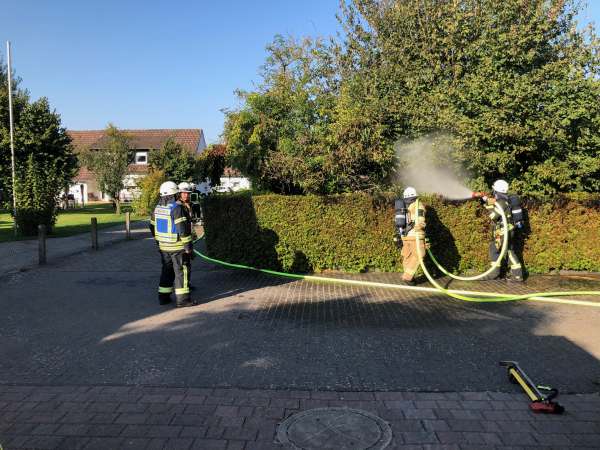 Ein Heckenbrand auf einer Länge von 10m wurde von einem Trupp unter Atemschutz mit einem C-Rohr abgelöscht.