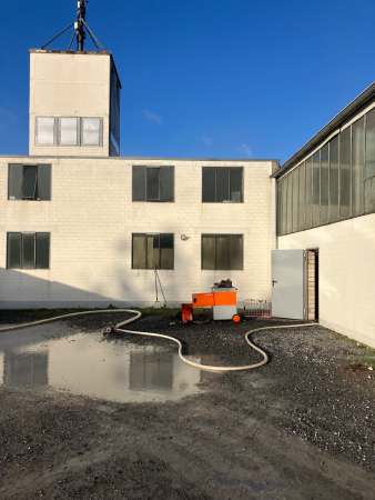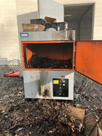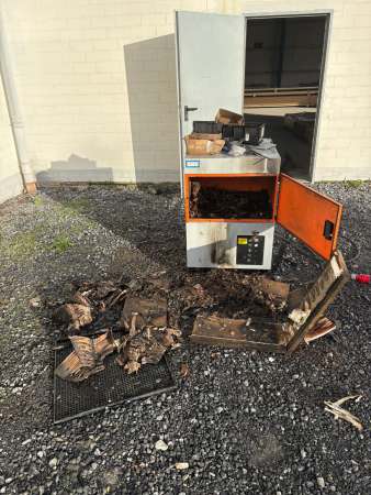 Im Außenbereich der Halle wurde die Maschine vollständig abgelöscht und geöffnet. Der integrierte Papierfilter brannte in voller Ausdehnung. Die Maschine und die entsprechenden Gebäudeteile wurden mit der Wärmebildkamera kontrolliert. Sämtliche Räumlichkeiten wurden mittels Hochleistungslüfter vom Rauch befreit.