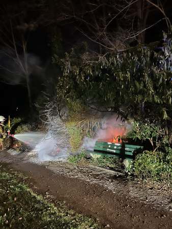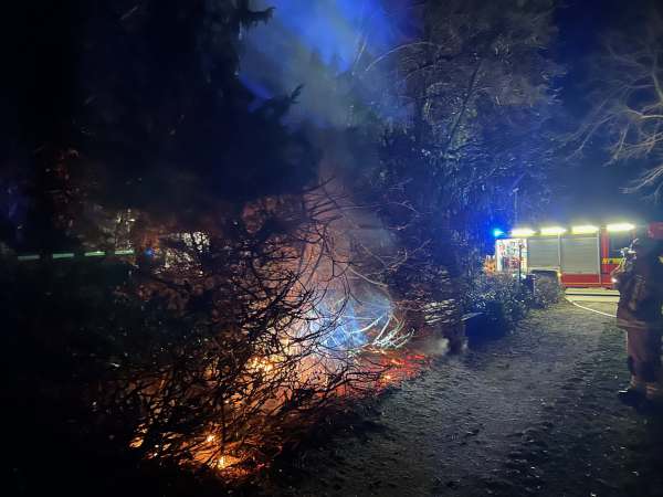 Gemeldet wurde ein Böschungsbrand an den Bahngleisen. Eine Hecke war auf einer Länge von 5 Meter am Brennen. Die Hecke wurde von einem Trupp mit einem C-Rohr abgelöscht. Die abgebrannte Hecke wurde mittels der Wärmebildkamera kontrolliert.
