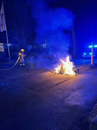 Zwei in voller Ausdehnung brennende Mülltonnen wurden von einem Trupp unter Atemschutz mit einem C-Rohr abgelöscht.