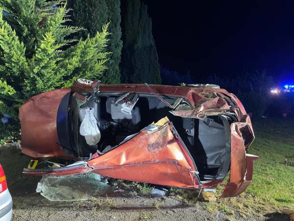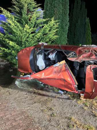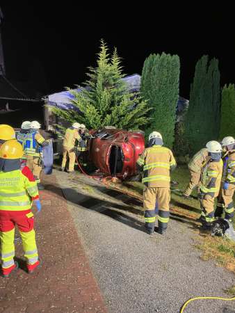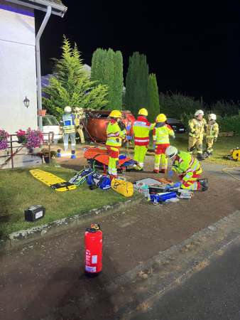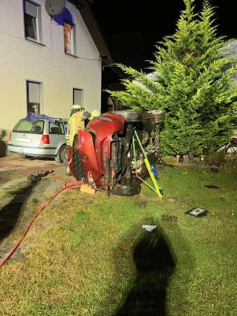 Aus ungeklärter Ursache ist ein Fahrzeug von der Fahrbahn abgekommen, hat sich dann auf einer Länge von ca. 150 m mehrmals überschlagen, ist über einen Gastank geflogen und ist dann vor einem Wohnhaus zum stehen gekommen.