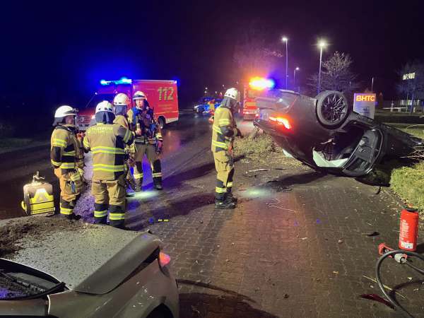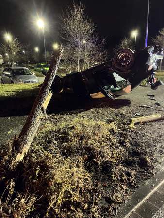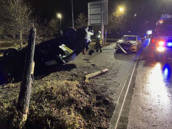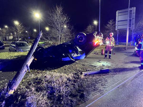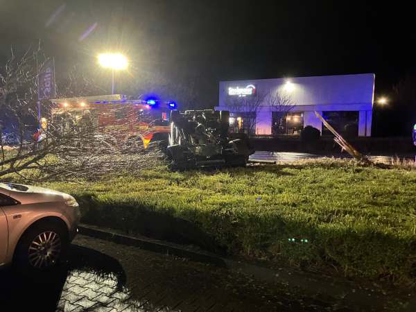 Aus ungeklärter Ursache ist ein Fahrzeug (BMW) von der Fahrbahn abgekommen, gegen einen Straßenbaum und ein parkendes Fahrzeug geprallt, dann hat sich das Fahrzeug überschlagen und ist dann halb auf dem Gehweg bzw. Grünstreifen auf dem Dach liegen geblieben.