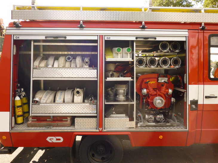 - 7er-Besatzung - 1.500 m B-Schlauch (bereits angekuppelt) Extrabestückung: - Tragkraftspritze TS 8/8 - 4 Atemschutzgeräte - Hubmast für Beleuchtung - Schlauchbrücke - Rettungsring